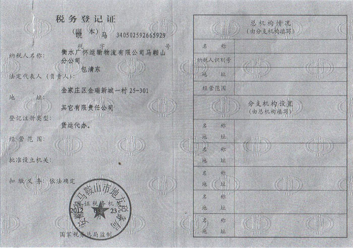 衡水广怀运输物流有限公司马鞍山分公司营业执照(正本) 衡水广怀运输物流有限公司马鞍山分公司营业执照(副本) 衡水广怀运输物流有限公司马鞍山分公司税务登记证 衡水广怀运输物流有限公司马鞍山分公司组织机构代码证